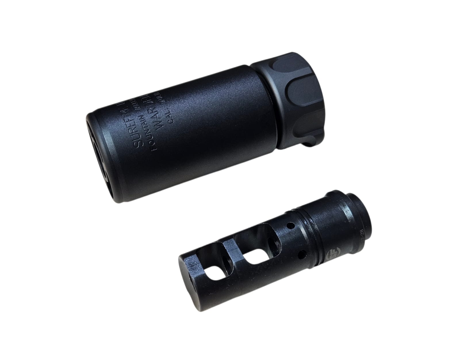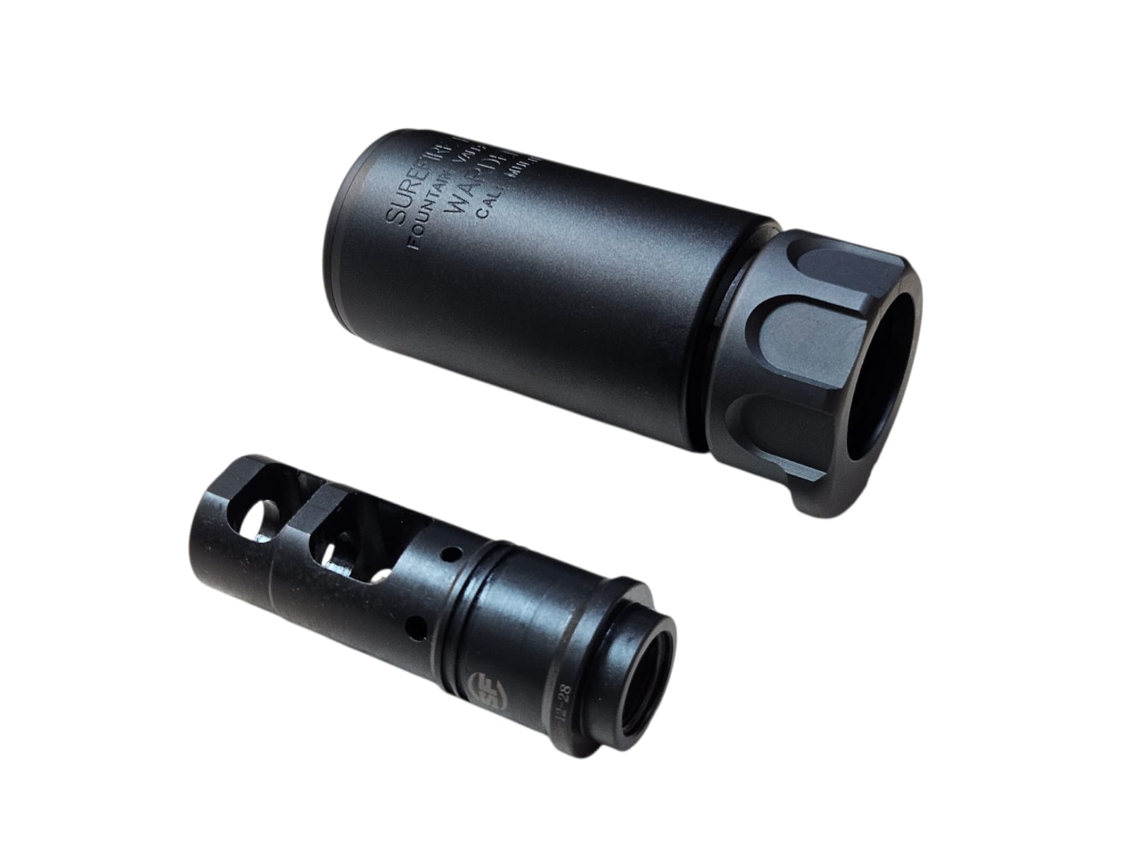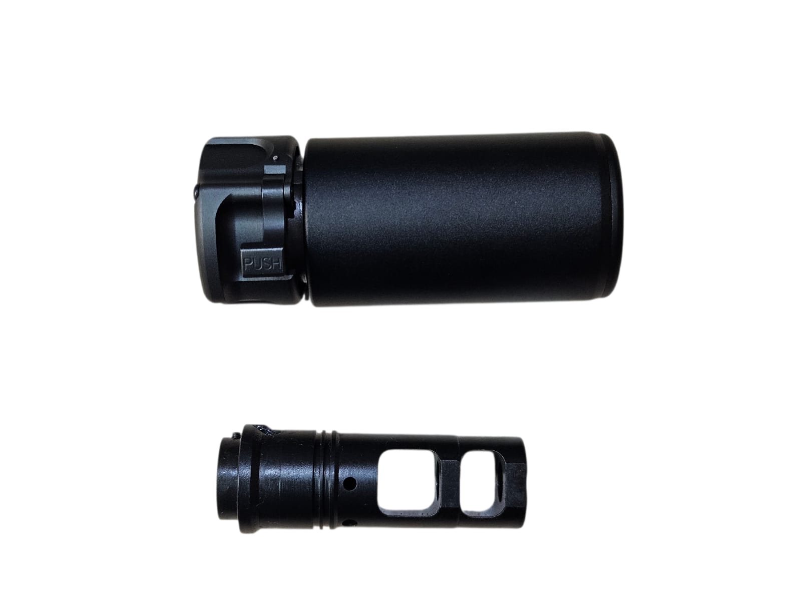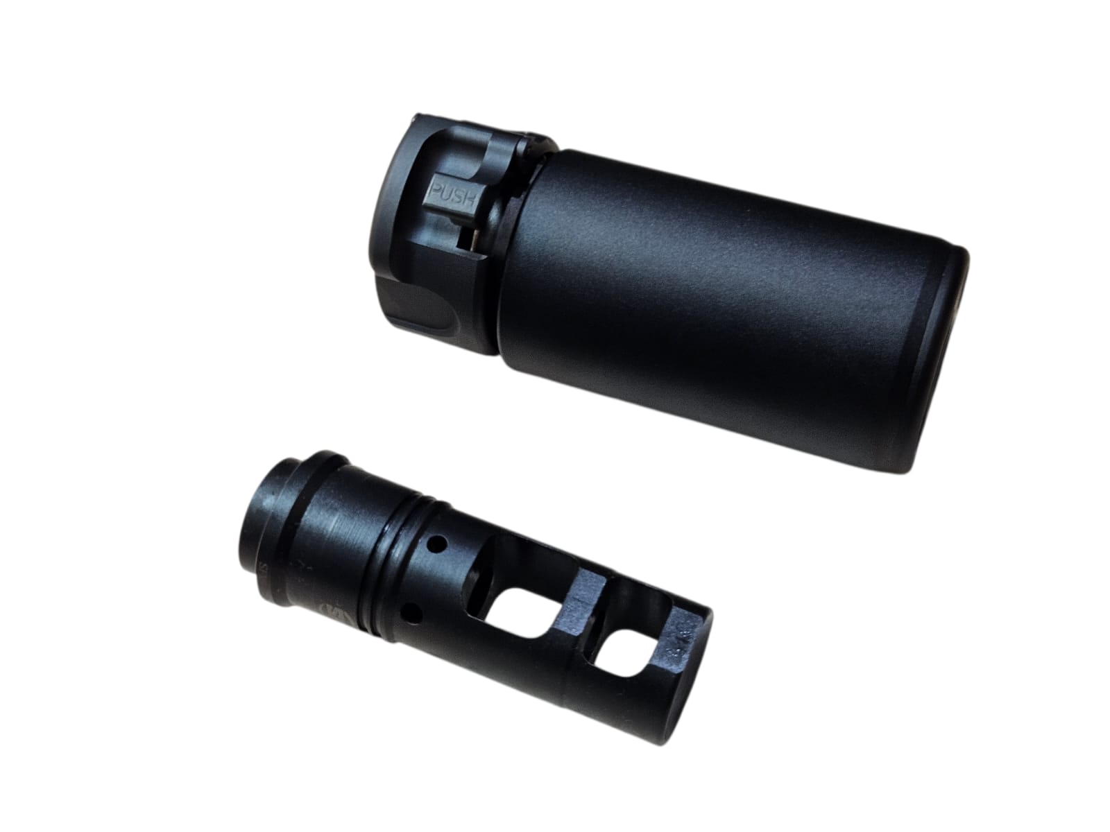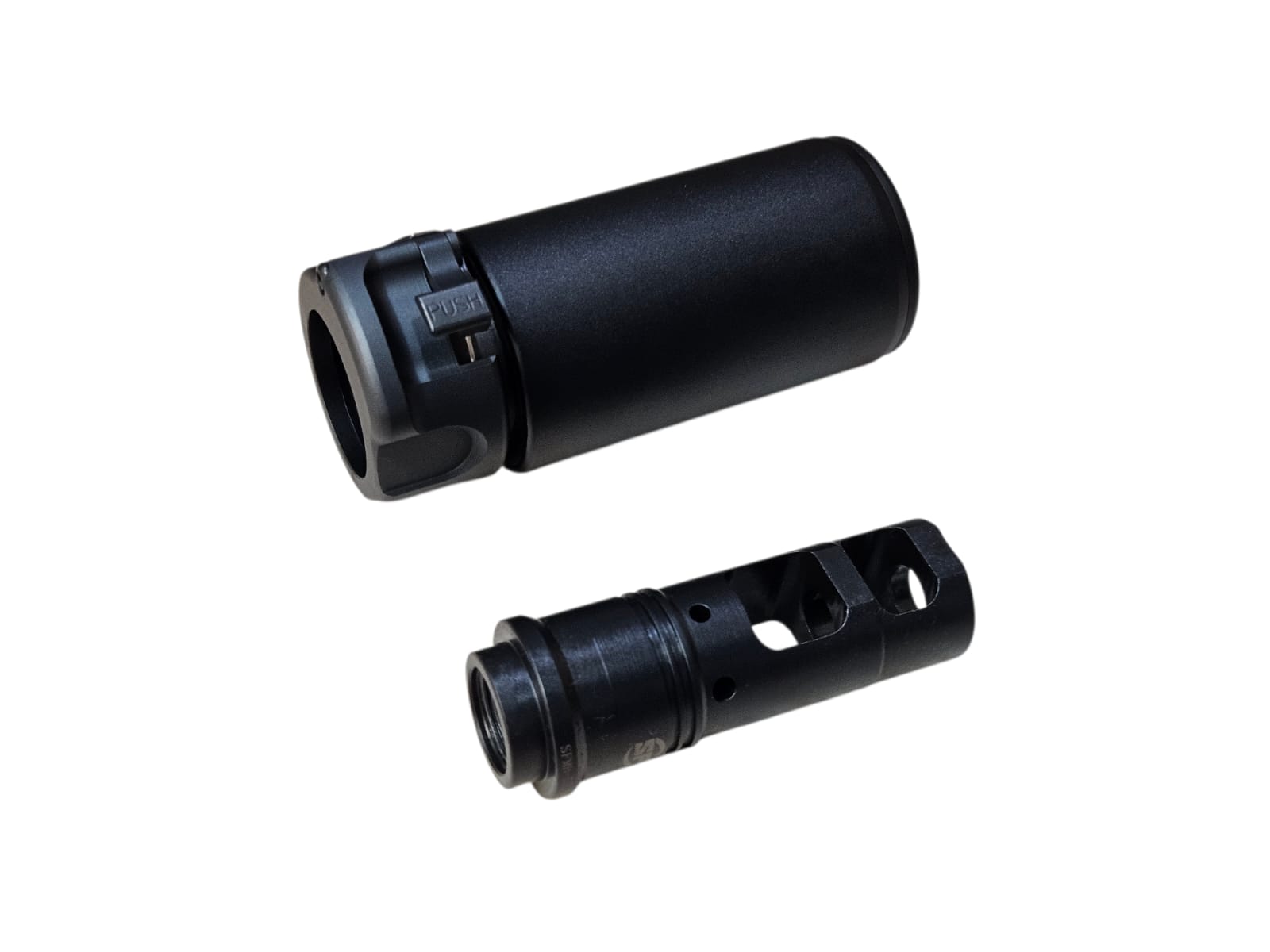 System: CNC aluminum blast silencer in black finish, engraved markings, designed to redirect muzzle blast forward, enhance realism, and provide tactical aesthetics