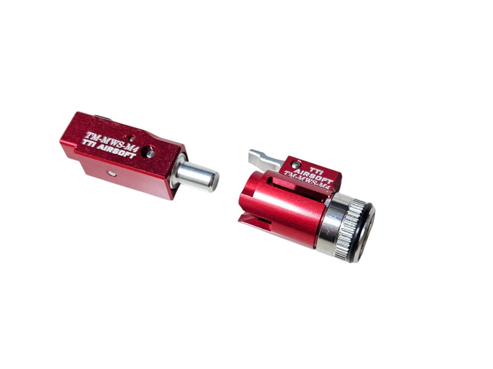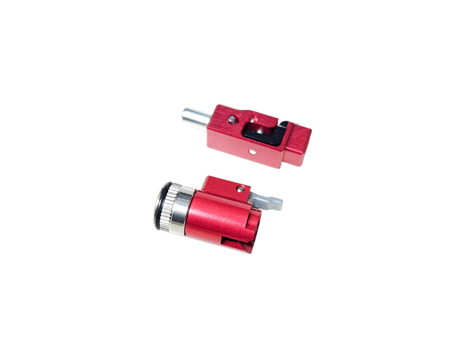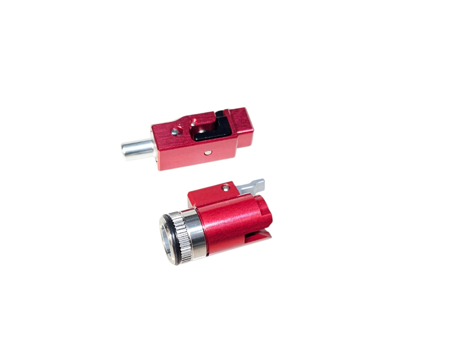 System: CNC aluminum hop holder in red finish, designed for enhanced durability, precise hop-up stability, improved air seal, and consistent shooting performance