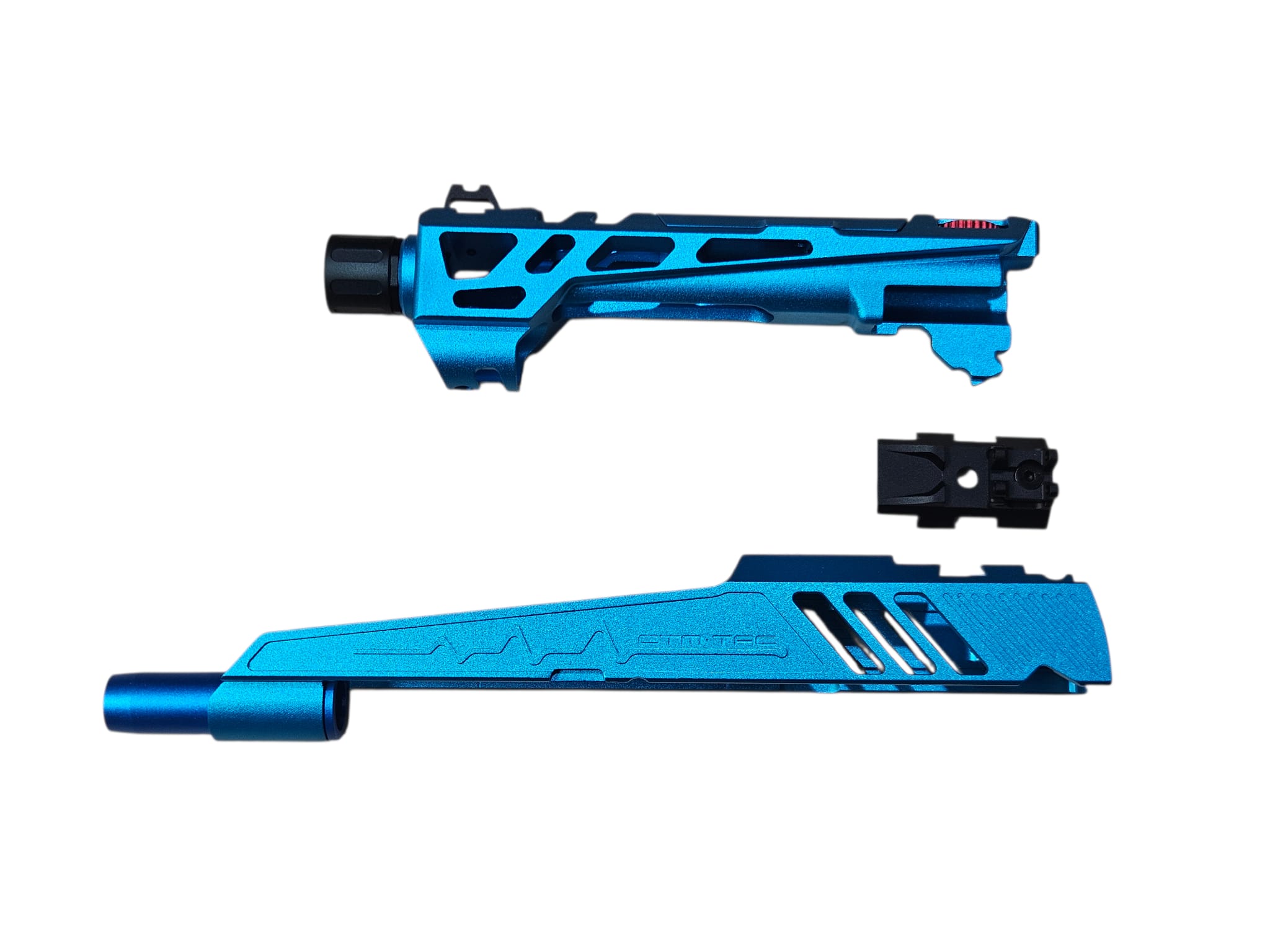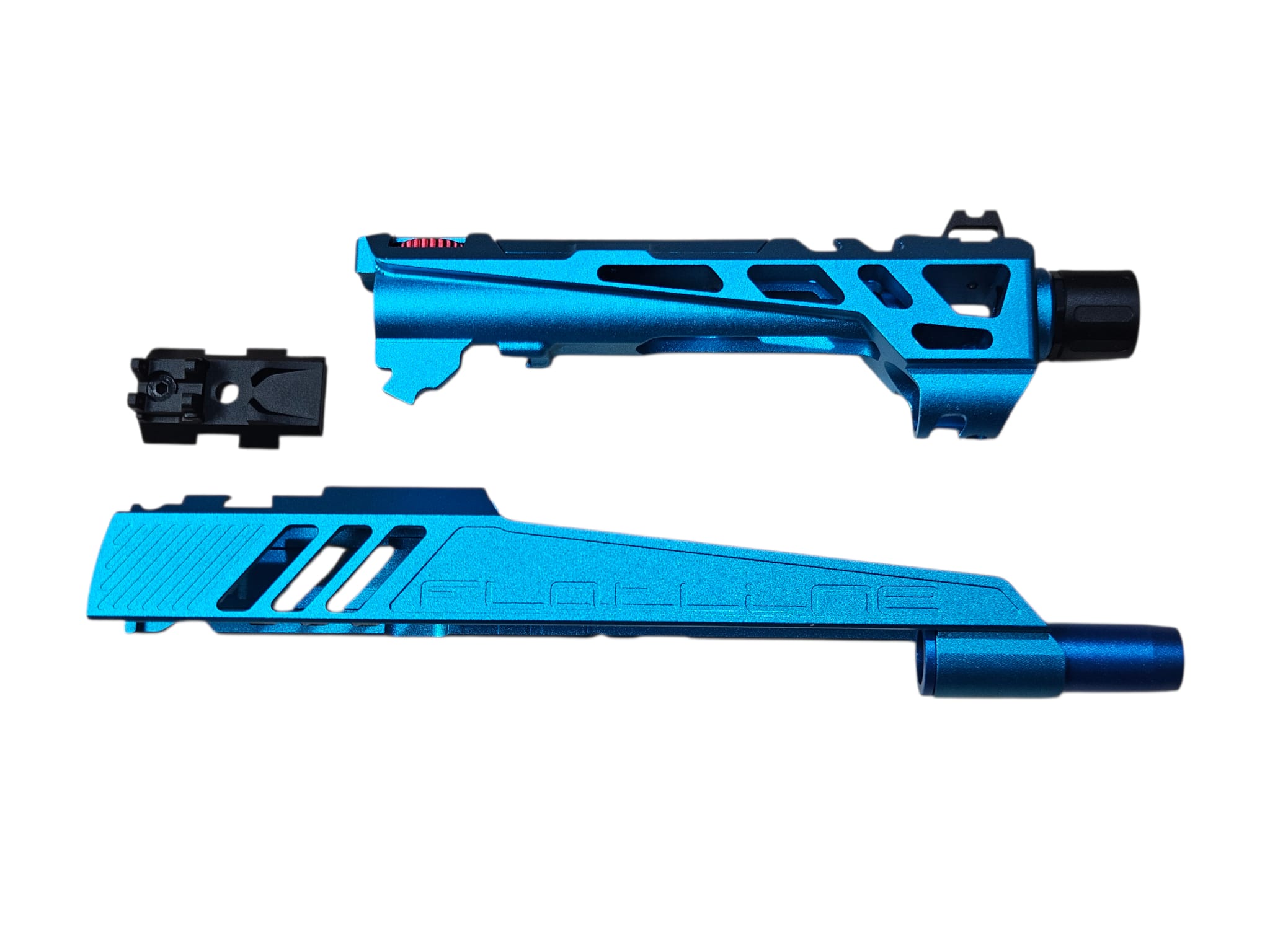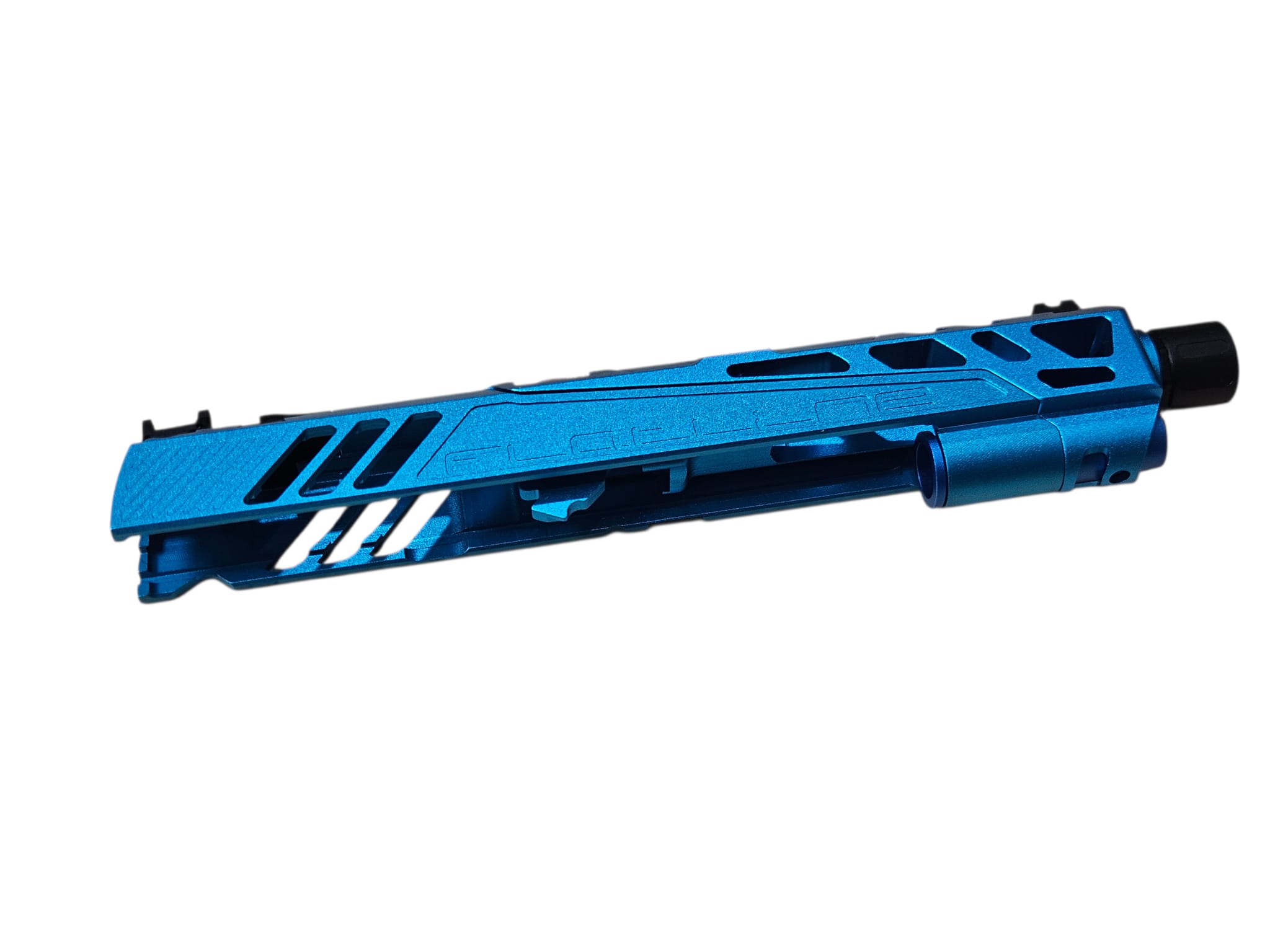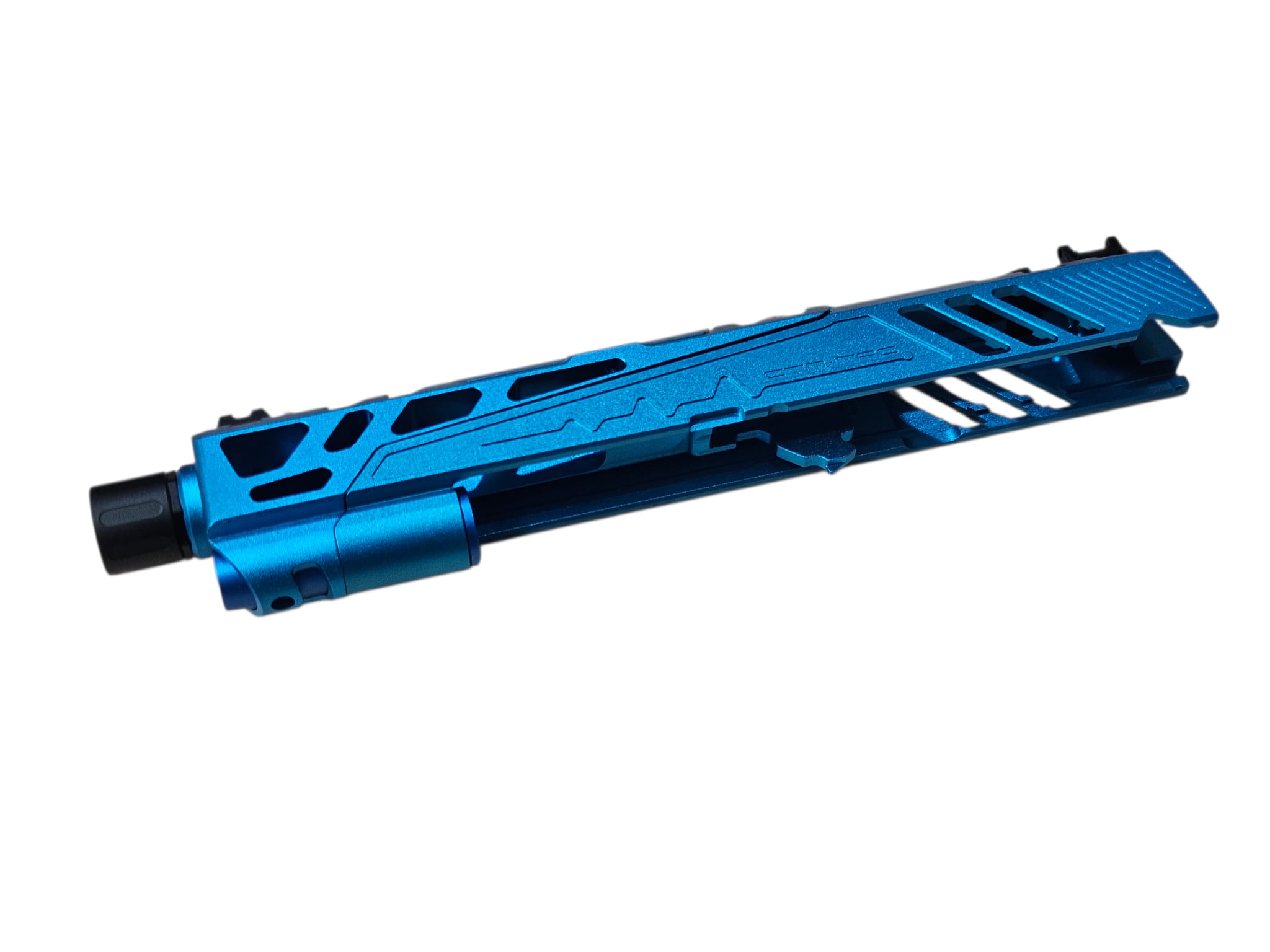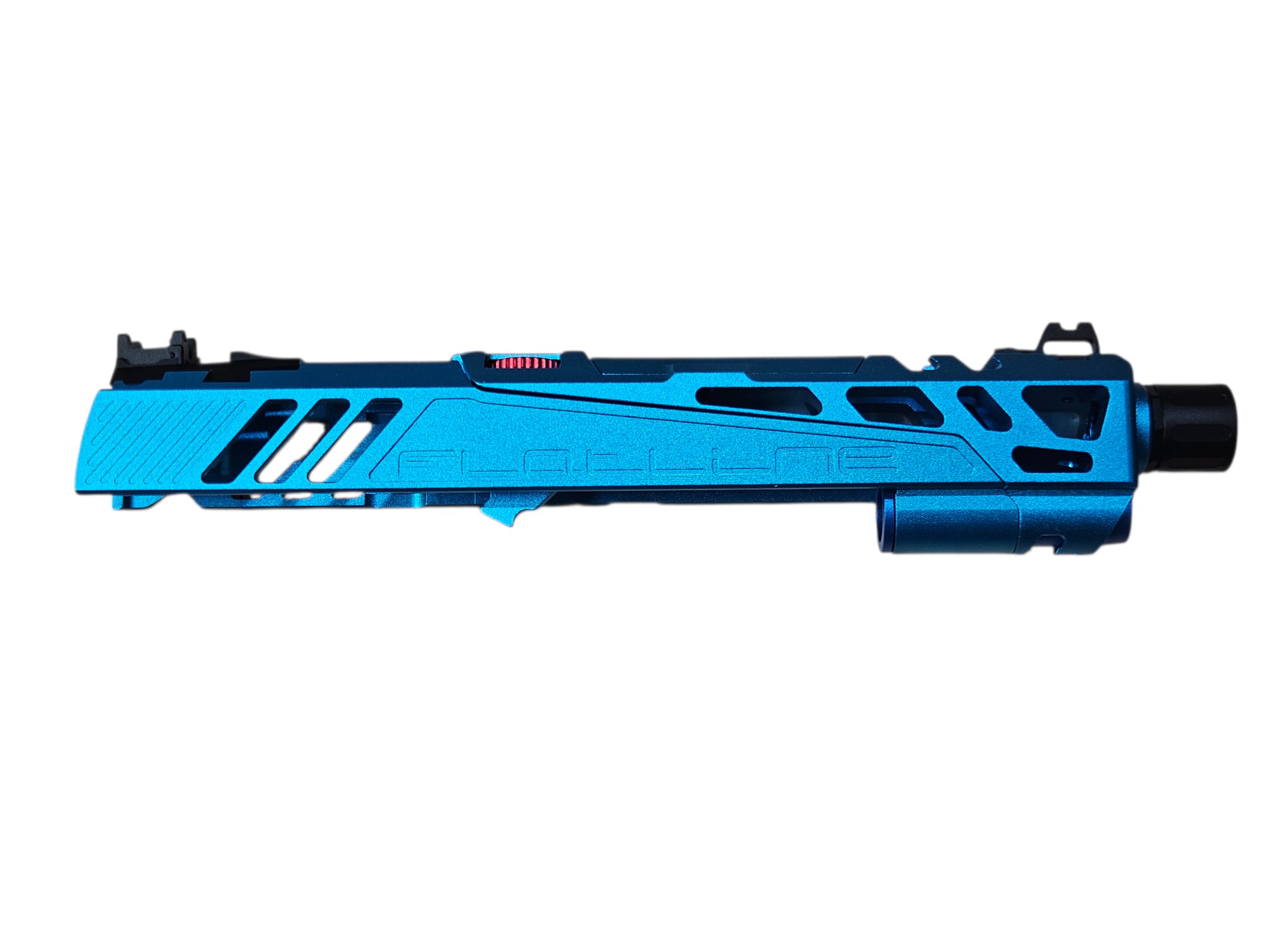 competitive shooting and advanced customization. Constructed from CNC aluminum alloy with anodized blue finish for durability and aesthetics. Split slide design reduces reciprocating mass, improving cycling speed, recoil control, and gas efficiency. Flatline cut enhances structural rigidity while maintaining lightweight performance. Ideal for IPSC competition and airsoft enthusiasts seeking both functional upgrades and distinctive styling.